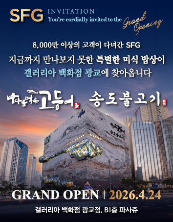 SFG 송도갈비, 인계동에 대형 업장 오픈…“포브스 선정 3대 갈비·대통령 오찬 품격 잇는다” 2026.04.02 SFG, 분당시니어클럽과 ‘자원 재순환’ 상생 협약…노인일자리·환경보호 동시 추진 2026.03.04 송도갈비, ‘2026 소비자선정 최고 브랜드 대상’ 3대 갈비 부문 대상…“K-갈비 대표 브랜드 위상 강화” 2026.02.27 [2026 소비자 선정 최고의 브랜드 대상] SFG 송도갈비 2026.02.27 SFG, '2026 대박 경품 이벤트 시즌2' 시작…"BMW 미니 등 1억 원 경품" 2026.02.06