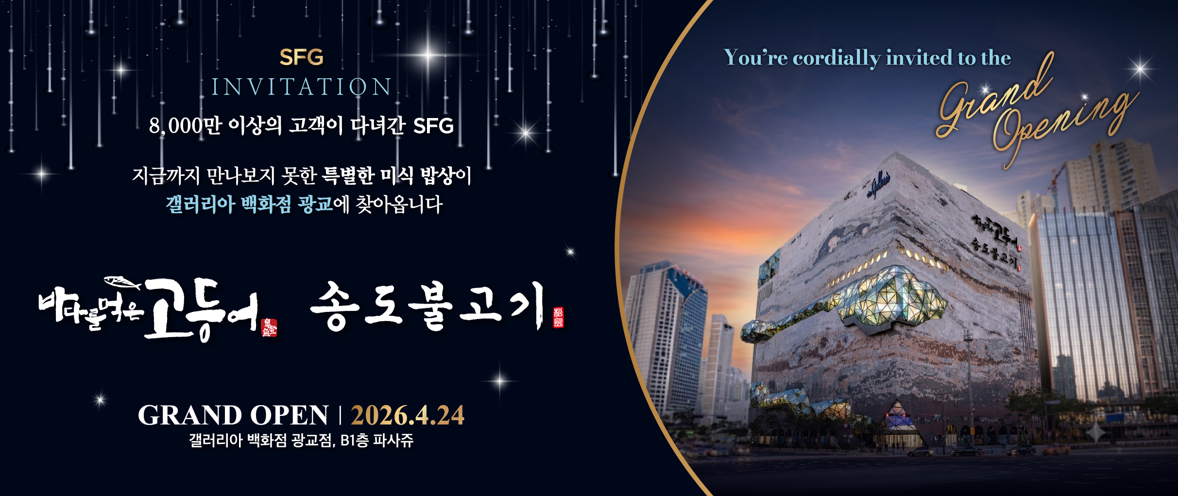 News 더 보기 다양한 SFG의 새로운 소식을 만나 보세요 SFG 송도갈비, 인계동에 대형 업장 오픈…“포브스 선정 3대 갈비·대통령 오찬 품격 잇는다” 2026.04.02 SFG, 분당시니어클럽과 ‘자원 재순환’ 상생 협약…노인일자리·환경보호 동시 추진 2026.03.04 송도갈비, ‘2026 소비자선정 최고 브랜드 대상’ 3대 갈비 부문 대상…“K-갈비 대표 브랜드 위상 강화” 2026.02.27 [2026 소비자 선정 최고의 브랜드 대상] SFG 송도갈비 2026.02.27 SFG, '2026 대박 경품 이벤트 시즌2' 시작…"BMW 미니 등 1억 원 경품" 2026.02.06 더 보기