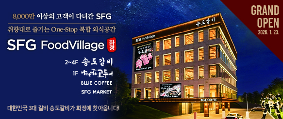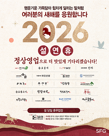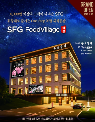 SFG, 고양 화정에 가족 미식 힐링 공간 ‘푸드빌리지’ 23일 오픈 2026.01.22 SFG, 2026 설 선물세트 사전예약…“누적 8천만 방문객 기념 최대 58% 할인” 2026.01.07 외식과 여행 잇는다…SFG, 노랑풍선과 손잡고 전략적 마케팅 협약 2025.12.22 SFG 신화푸드그룹, 크리스마스 앞두고 사당청소년센터에 연말 ‘인정’ 나눔 2025.12.22 Who멤버십 이용약관 개정 안내 2025.12.17