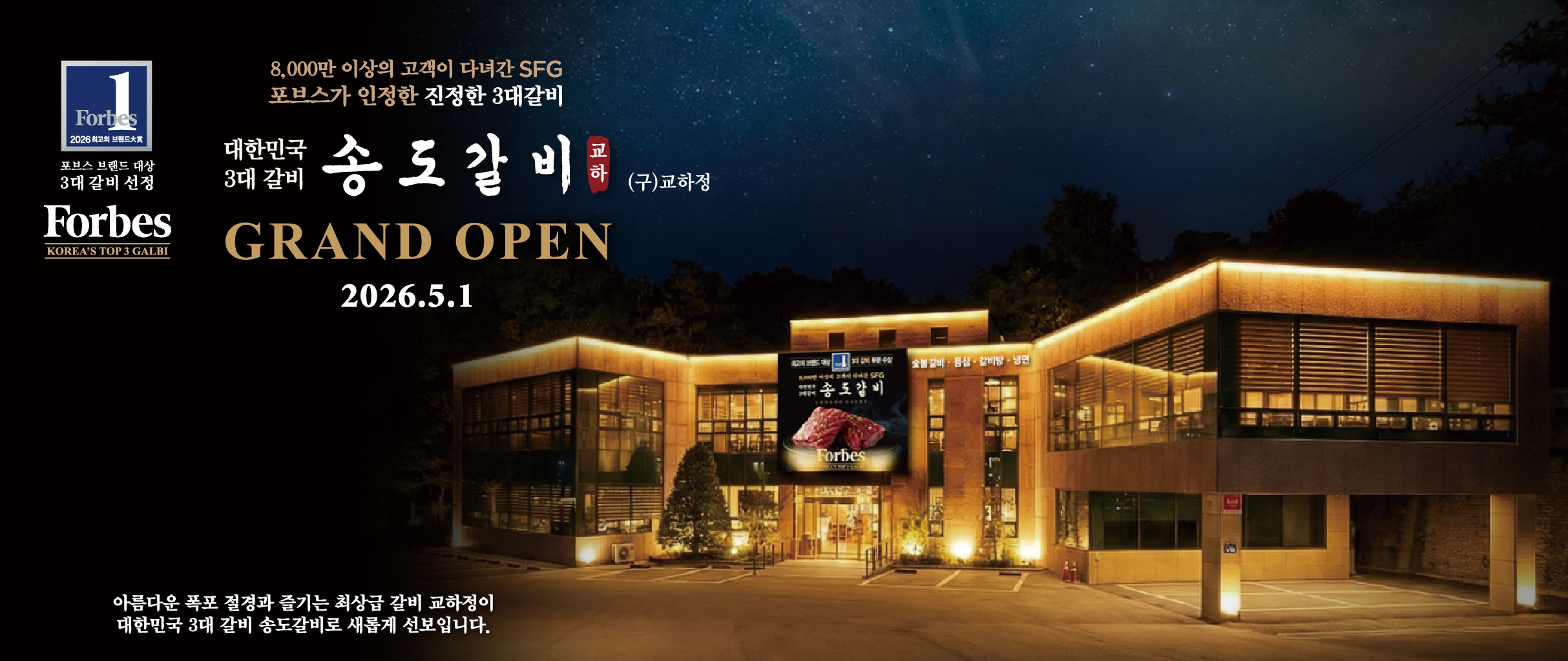 News 더 보기 다양한 SFG의 새로운 소식을 만나 보세요 SFG, 광교 갤러리아백화점에 ‘육해진미’ 미식 라운지 오픈 2026.04.22 SFG 송도갈비, 인계동에 대형 업장 오픈…“포브스 선정 3대 갈비·대통령 오찬 품격 잇는다” 2026.04.02 SFG, 분당시니어클럽과 ‘자원 재순환’ 상생 협약…노인일자리·환경보호 동시 추진 2026.03.04 송도갈비, ‘2026 소비자선정 최고 브랜드 대상’ 3대 갈비 부문 대상…“K-갈비 대표 브랜드 위상 강화” 2026.02.27 [2026 소비자 선정 최고의 브랜드 대상] SFG 송도갈비 2026.02.27 더 보기