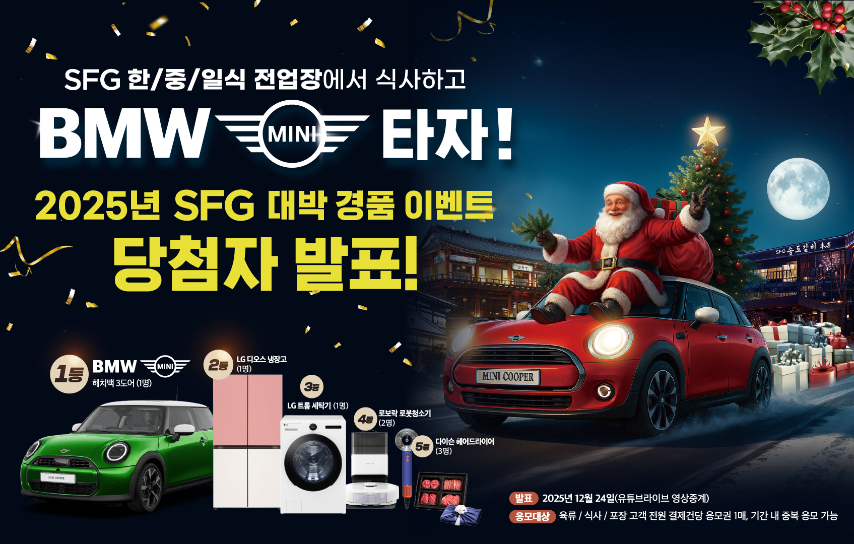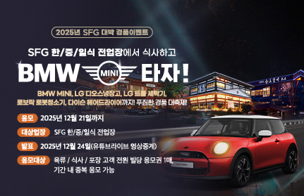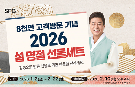 [프로모션] 2026 설 명절 선물세트 사전예약 진행중 2026.01.02-2026.02.22 조회수:12 [공지] 2025 SFG 대박 경품 이벤트 당첨자 안내 종료 2025.12.24-2025.12.31 조회수:4076 [이벤트] 2025년 대박 경품 이벤트 발표회 종료 2025.12.22-2025.12.25 조회수:761 [프로모션] SFG&KT '달달혜택' 프로모션 진행 중 종료 2025.11.14-2025.11.30 조회수:2314 [이벤트] SFG 고객 감사 프로모션 진행중 2025.11.14-2026.01.11 조회수:985 WHO Eats Festival – 지금 내 포인트가, 맛있는 한 끼가 됩니다! 종료 2025.10.31-2025.11.30 조회수:4856 [오픈] 대한민국 최강 정통일식, 일본요리 긴자 사당점 오픈 종료 2025.10.31-2025.11.30 조회수:3839 [오픈] 대한민국 3대갈비 송도갈비 광장점 오픈 종료 2025.09.24-2025.10.24 조회수:2542 [오픈] 생선구이 건강 한상, 바다를 먹은 고등어 세종점 오픈 종료 2025.09.10-2025.10.10 조회수:1123 [프로모션] 2025 추석 명절 선물세트 사전예약 종료 2025.08.29-2025.10.12 조회수:7579 [NEW] SFG 신메뉴 출시 이벤트! 종료 2025.07.17-2025.09.30 조회수:9688 [이벤트] 돈블랑 야구 응원 이벤트! 당첨자 발표 종료 2025.07.09-2025.07.09 조회수:628 [오픈] 바다의 생기를 먹음은 생선구이 한상, 바다를먹은 고등어 종료 2025.06.20-2025.07.20 조회수:2386 [이벤트] 돈블랑 야구 응원 이벤트! 종료 2025.06.18-2025.07.02 조회수:1183 [송도갈비 자하문] OPEN 이벤트 당첨자 발표 종료 2025.04.19-2025.04.30 조회수:1843 [이벤트] 2025년 상반기 구매 고객 100% 증정 사은 이벤트 종료 2025.03.22-2025.06.22 조회수:3772 [이벤트] 2025, SFG 대박 경품이벤트 진행 중! 종료 2025.03.08-2025.12.21 조회수:15691 [이벤트] 카카오톡 채널 가입 이벤트 종료 2025.03.08-2025.12.21 조회수:3429 [오픈] 대한민국 3대갈비 송도갈비, 서울 종로시대 선언 종료 2025.02.27-2025.03.28 조회수:2250 [오픈] 청담 연예인 맛집, 돈블랑 수내 상륙! 종료 2025.01.22-2020.02.22 조회수:2181 [오픈] 청담본갈비, 드디어 세종에 상륙하다! 종료 2025.01.17-2025.02.16 조회수:2050 [안내] 2025년 설 연휴 영업 안내 종료 2025.01.10-2025.01.31 조회수:1577 [오픈] 무봉산에서 맛보는 숙성 숯불구이, 자작나무갈비 무봉산 오픈 종료 2024.12.20-2025.01.20 조회수:2920 [이벤트] 2025년 귀한 선물세트 사전예약 진행! 종료 2024.12.19-2025.01.19 조회수:2948 [이벤트] 윈터 홀리데이 미리 크리스마스 이벤트 종료 2024.12.01-2024.12.15 조회수:1435 [오픈] 맑은 물의 신선함을 정성스레 담아낸 일식의 정수, 청담일식 분당 서현 그랜드 오픈 종료 2024.11.26-2024.12.31 조회수:2714 [오픈] 대한민국 대표 중국요리 하인선생, 송도유원지 그랜드 오픈 종료 2024.11.20-2024.12.31 조회수:2527 [이벤트] 2024년 하반기 고객 감사 100% 사은품 증정 이벤트 종료 2024.11.13-2024.12.30 조회수:1946 [오픈] 대한민국 3대 갈비 송도갈비, 광명 밤일맛집거리에 등장하다 종료 2024.11.07-2024.12.07 조회수:3080 [오픈] 대한민국 3대갈비 송도갈비, 서울 창동에 상륙하다! 종료 2024.10.25-2024.11.25 조회수:3224 [이벤트] 뮤지컬 Dear, My 파더 종료 2024.09.24-2024.09.30 조회수:1944 [All New] 최상급을 넘은 숙성 生돼지고깃집 돈블랑 석촌호수 종료 2024.08.22-2024.09.22 조회수:2954 [이벤트] SFG, 2024년 추석 맞이 초특가 할인 행사 진행 중!! 종료 2024.08.10-2024.09.18 조회수:5814 [리뉴얼] 수내역 맛집, 수내 한판등심 리뉴얼 오픈 종료 2024.08.08-2024.09.09 조회수:3503 [오픈] 호수뷰가 아름다운 용인 어비리, 송도갈비 오픈 종료 2024.07.26-2024.08.26 조회수:3644 [오픈] 올림픽공원 줄 서서 먹는 맛집, 송도불고기 오픈 종료 2024.06.01-2024.07.01 조회수:5917 [오픈] 송도불고기 세종, 중흥S클래스 센텀뷰에 GRAND OPEN 종료 2024.05.23-2024.06.24 조회수:6333 [이벤트] 한판등심&송도불고기 먹고 푸짐한 가전 경품 한판 받자! 종료 2024.05.21-2024.12.31 조회수:6448 [이벤트] 고객 감사 100% 증정 사은 이벤트 종료 2024.03.23-2024.05.31 조회수:7463 [이벤트] 히트브랜드 대상 1위 기념 고객 사은 프로모션 종료 2024.03.15-2024.05.20 조회수:7223 [오픈] 한판등심 용인 어비리 오픈 종료 2024.02.07-2024.03.08 조회수:7118 [이벤트] 2024 설맞이 귀한선물세트 사전예약 실시 종료 2024.01.15-2024.02.12 조회수:3975 [오픈] 한판등심 광명 오픈 종료 2024.01.12-2024.02.11 조회수:5145 [오픈] 푸드빌리지 세종 한판등심 오픈 종료 2024.01.05-2024.02.05 조회수:3958 [오픈] 인천 영종도, 송도갈비 오픈 종료 2023.12.19-2024.01.18 조회수:3668 [오픈] 푸드빌리지 세종 더:봉팡 오픈 종료 2023.12.17-2024.01.17 조회수:4945 [확장오픈] 청담 블루 긴자 코스요리 전문관 확장 오픈 종료 2023.12.12-2024.01.12 조회수:2288 [오픈] 한판등심 분당 수내 오픈 종료 2023.12.10-2024.01.10 조회수:3873 [오픈] 푸드빌리지 세종 숯불주물럭넘버9 오픈 종료 2023.11.03-2023.12.03 조회수:5393 [이벤트] 오늘 저녁은 우리집이 맛집! 대용량 한상차림 고객사은 이벤트 종료 2023.11.18-2024.01.14 조회수:2090