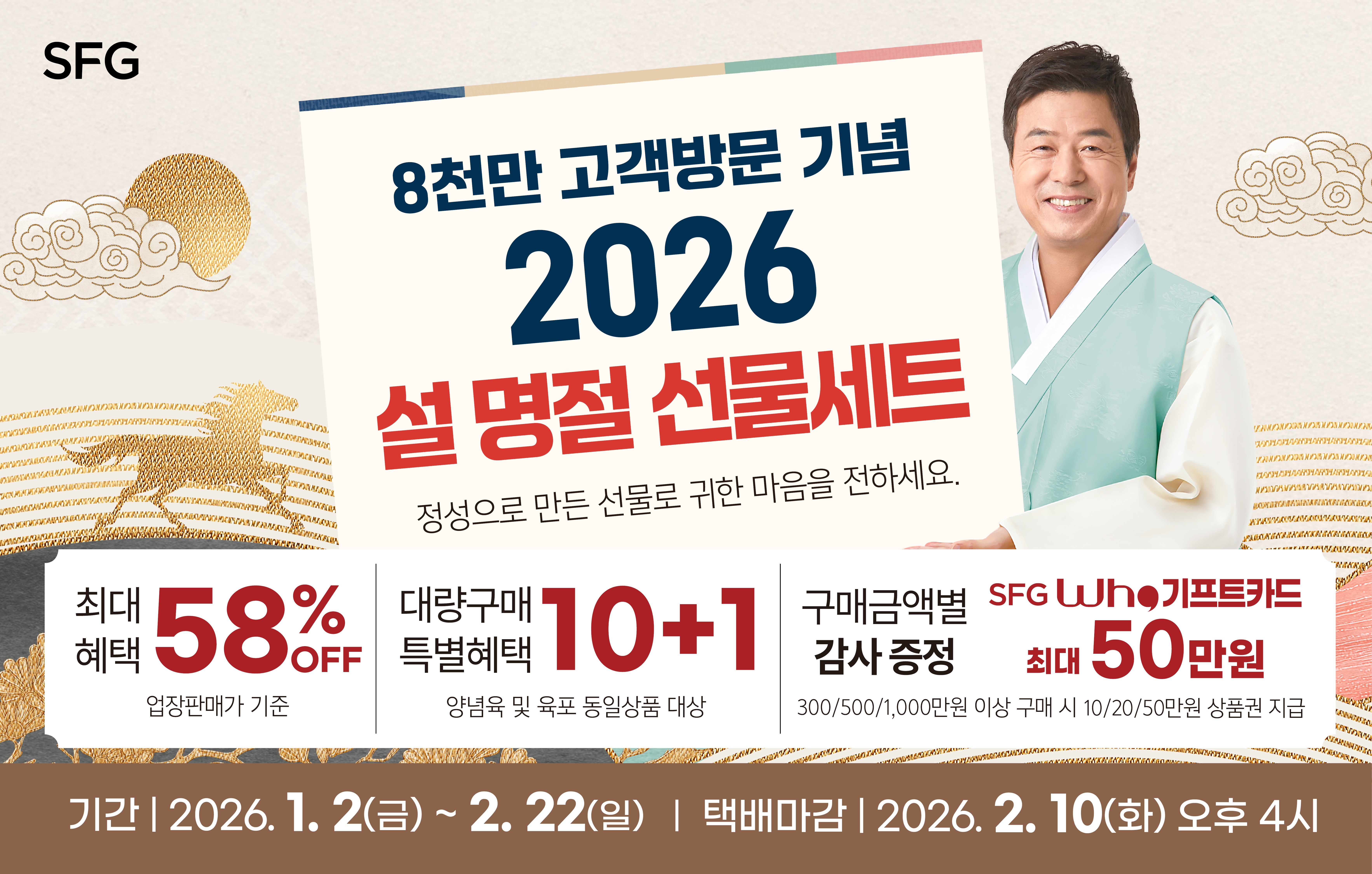 [프로모션] 2026 설 명절 선물세트 사전예약 진행중 2026.01.02-2026.02.22 조회수:1220 [공지] 2025 SFG 대박 경품 이벤트 당첨자 안내 종료 2025.12.24-2025.12.31 조회수:6493 [이벤트] 2025년 대박 경품 이벤트 발표회 종료 2025.12.22-2025.12.25 조회수:881 [프로모션] SFG&KT '달달혜택' 프로모션 진행 중 종료 2025.11.14-2025.11.30 조회수:2423 [이벤트] SFG 고객 감사 프로모션 종료 2025.11.14-2026.01.11 조회수:1059 WHO Eats Festival – 지금 내 포인트가, 맛있는 한 끼가 됩니다! 종료 2025.10.31-2025.11.30 조회수:5010 [오픈] 대한민국 최강 정통일식, 일본요리 긴자 사당점 오픈 종료 2025.10.31-2025.11.30 조회수:4006 [오픈] 대한민국 3대갈비 송도갈비 광장점 오픈 종료 2025.09.24-2025.10.24 조회수:2626 [오픈] 생선구이 건강 한상, 바다를 먹은 고등어 세종점 오픈 종료 2025.09.10-2025.10.10 조회수:1174 [프로모션] 2025 추석 명절 선물세트 사전예약 종료 2025.08.29-2025.10.12 조회수:7650 [NEW] SFG 신메뉴 출시 이벤트! 종료 2025.07.17-2025.09.30 조회수:9827 [이벤트] 돈블랑 야구 응원 이벤트! 당첨자 발표 종료 2025.07.09-2025.07.09 조회수:678 [오픈] 바다의 생기를 먹음은 생선구이 한상, 바다를먹은 고등어 종료 2025.06.20-2025.07.20 조회수:2443 [이벤트] 돈블랑 야구 응원 이벤트! 종료 2025.06.18-2025.07.02 조회수:1243 [송도갈비 자하문] OPEN 이벤트 당첨자 발표 종료 2025.04.19-2025.04.30 조회수:1948 [이벤트] 2025년 상반기 구매 고객 100% 증정 사은 이벤트 종료 2025.03.22-2025.06.22 조회수:3837 [이벤트] 2025, SFG 대박 경품이벤트 진행 중! 종료 2025.03.08-2025.12.21 조회수:15842 [이벤트] 카카오톡 채널 가입 이벤트 종료 2025.03.08-2025.12.21 조회수:3502 [오픈] 대한민국 3대갈비 송도갈비, 서울 종로시대 선언 종료 2025.02.27-2025.03.28 조회수:2316 [오픈] 청담 연예인 맛집, 돈블랑 수내 상륙! 종료 2025.01.22-2020.02.22 조회수:2233 [오픈] 청담본갈비, 드디어 세종에 상륙하다! 종료 2025.01.17-2025.02.16 조회수:2124 [안내] 2025년 설 연휴 영업 안내 종료 2025.01.10-2025.01.31 조회수:1634 [오픈] 무봉산에서 맛보는 숙성 숯불구이, 자작나무갈비 무봉산 오픈 종료 2024.12.20-2025.01.20 조회수:2972 [이벤트] 2025년 귀한 선물세트 사전예약 진행! 종료 2024.12.19-2025.01.19 조회수:3000 [이벤트] 윈터 홀리데이 미리 크리스마스 이벤트 종료 2024.12.01-2024.12.15 조회수:1495 [오픈] 맑은 물의 신선함을 정성스레 담아낸 일식의 정수, 청담일식 분당 서현 그랜드 오픈 종료 2024.11.26-2024.12.31 조회수:2764 [오픈] 대한민국 대표 중국요리 하인선생, 송도유원지 그랜드 오픈 종료 2024.11.20-2024.12.31 조회수:2587 [이벤트] 2024년 하반기 고객 감사 100% 사은품 증정 이벤트 종료 2024.11.13-2024.12.30 조회수:2006 [오픈] 대한민국 3대 갈비 송도갈비, 광명 밤일맛집거리에 등장하다 종료 2024.11.07-2024.12.07 조회수:3172 [오픈] 대한민국 3대갈비 송도갈비, 서울 창동에 상륙하다! 종료 2024.10.25-2024.11.25 조회수:3307 [이벤트] 뮤지컬 Dear, My 파더 종료 2024.09.24-2024.09.30 조회수:1995 [All New] 최상급을 넘은 숙성 生돼지고깃집 돈블랑 석촌호수 종료 2024.08.22-2024.09.22 조회수:3015 [이벤트] SFG, 2024년 추석 맞이 초특가 할인 행사 진행 중!! 종료 2024.08.10-2024.09.18 조회수:5866 [리뉴얼] 수내역 맛집, 수내 한판등심 리뉴얼 오픈 종료 2024.08.08-2024.09.09 조회수:3573 [오픈] 호수뷰가 아름다운 용인 어비리, 송도갈비 오픈 종료 2024.07.26-2024.08.26 조회수:3709 [오픈] 올림픽공원 줄 서서 먹는 맛집, 송도불고기 오픈 종료 2024.06.01-2024.07.01 조회수:6003 [오픈] 송도불고기 세종, 중흥S클래스 센텀뷰에 GRAND OPEN 종료 2024.05.23-2024.06.24 조회수:6407 [이벤트] 한판등심&송도불고기 먹고 푸짐한 가전 경품 한판 받자! 종료 2024.05.21-2024.12.31 조회수:6529 [이벤트] 고객 감사 100% 증정 사은 이벤트 종료 2024.03.23-2024.05.31 조회수:7528 [이벤트] 히트브랜드 대상 1위 기념 고객 사은 프로모션 종료 2024.03.15-2024.05.20 조회수:7297 [오픈] 한판등심 용인 어비리 오픈 종료 2024.02.07-2024.03.08 조회수:7184 [이벤트] 2024 설맞이 귀한선물세트 사전예약 실시 종료 2024.01.15-2024.02.12 조회수:4044 [오픈] 한판등심 광명 오픈 종료 2024.01.12-2024.02.11 조회수:5214 [오픈] 푸드빌리지 세종 한판등심 오픈 종료 2024.01.05-2024.02.05 조회수:4020 [오픈] 인천 영종도, 송도갈비 오픈 종료 2023.12.19-2024.01.18 조회수:3743 [오픈] 푸드빌리지 세종 더:봉팡 오픈 종료 2023.12.17-2024.01.17 조회수:5006 [확장오픈] 청담 블루 긴자 코스요리 전문관 확장 오픈 종료 2023.12.12-2024.01.12 조회수:2340 [오픈] 한판등심 분당 수내 오픈 종료 2023.12.10-2024.01.10 조회수:3937 [오픈] 푸드빌리지 세종 숯불주물럭넘버9 오픈 종료 2023.11.03-2023.12.03 조회수:5451 [이벤트] 오늘 저녁은 우리집이 맛집! 대용량 한상차림 고객사은 이벤트 종료 2023.11.18-2024.01.14 조회수:2135